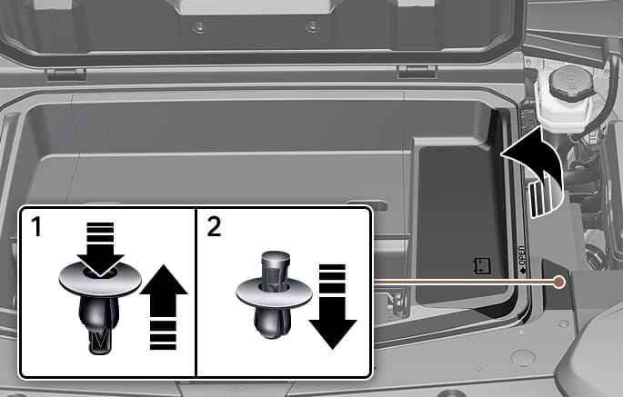 차량의 12 V 배터리는 테일게이트 바닥판 아래에 있지만 점프 스타트할 때는 모터룸에 있는 점프 스타트 단자를 이용하십시오.