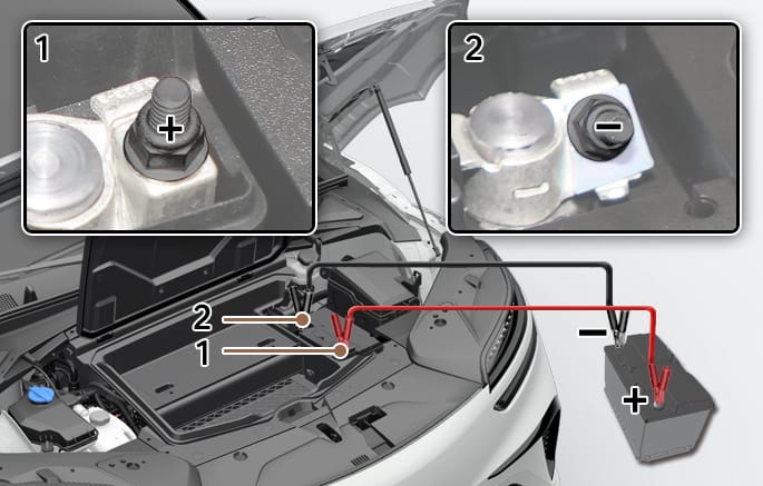 점프 케이블을 이용해 다른 차량의 배터리나 보조 배터리를 차량에 연결해 시동을 걸 수 있습니다.