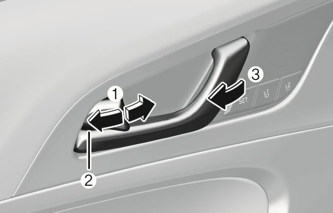 운전석 도어는 도어 잠금 버튼(1)이 ‘잠금’ 위치에 있어도 도어 핸들(3)만 잡아 당기면 도어 잠금 버튼이 해제되면서 도어가 열립니다.