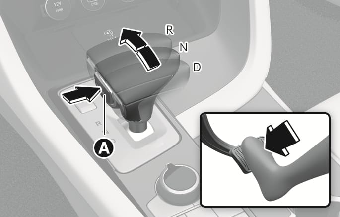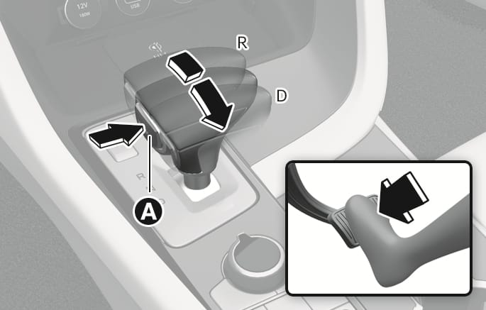 ‘R’(후진) 위치로 변속하기 위해서는 브레이크 페달을 밟고 변속 레버의 UNLOCK 버튼을 누른 상태에서 변속 레버를 앞으로 이동하십시오.