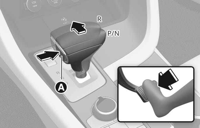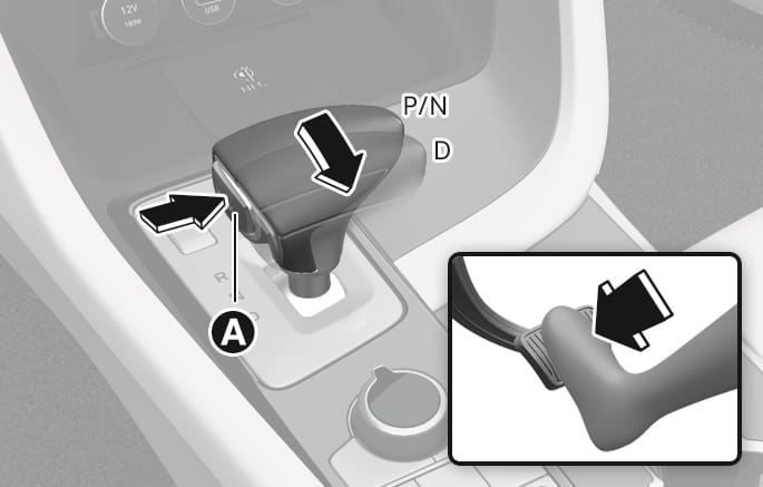 브레이크 페달을 밟고 변속 레버 앞쪽에 위치한 P RELEASE 버튼을 누르면 ‘N’(중립) 위치로 변속합니다. P 버튼을 누르면 ‘P’(주차) 위치로 다시 변속 가능합니다. 시동을 끄고 20초 동안만 ‘N’(중립) ↔ ‘P’(주차) 변속이 가능합니다.