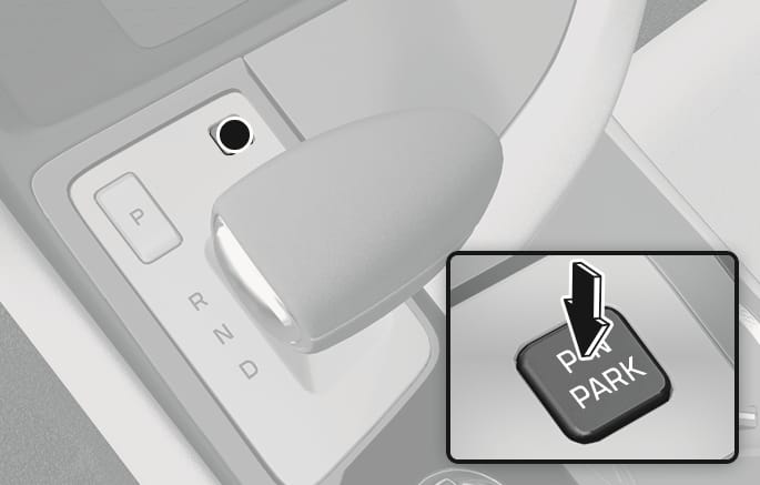 'R'(후진), 'N'(중립), 'D'(주행) 위치에서 ‘P’(주차)로 변속하기 위해서는 차량이 정지한 상태에서 P 버튼을 누르십시오.
