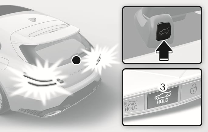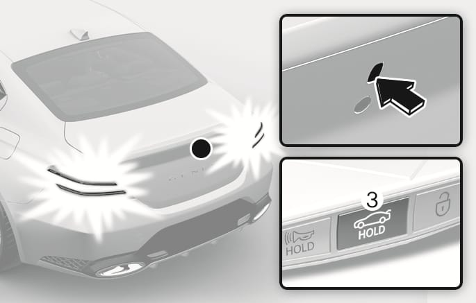 트렁크(또는 테일게이트)가 열립니다. 비상 경고등이 2회 깜빡여 트렁크(또는 테일게이트)가 열렸음을 알려줍니다.