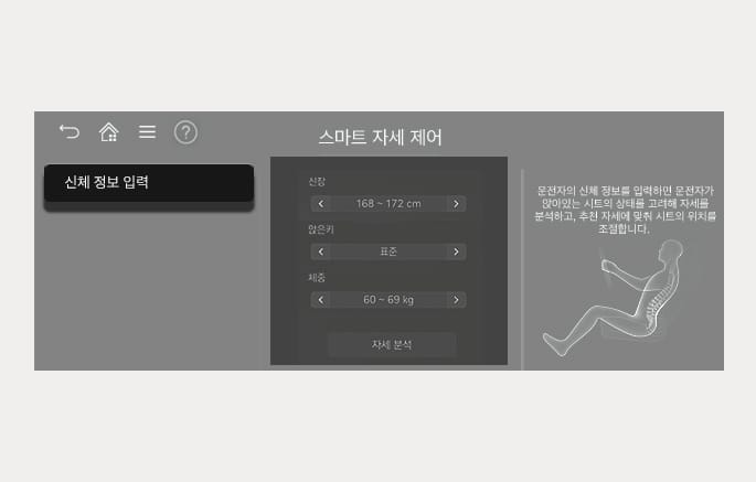 스마트 자세 제어 시스템은 인포테인먼트 시스템을 통해 입력된 운전자의 신체 정보에 따라 운전에 적합한 승차 자세를 자동으로 설정해주는 장치입니다.