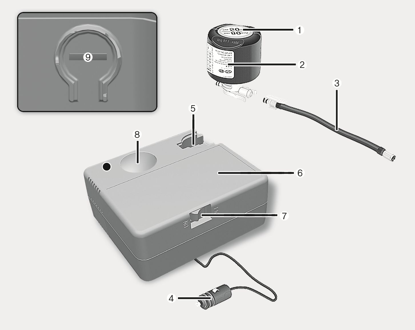 - Pressure gauge for displaying the tire inflation pressure