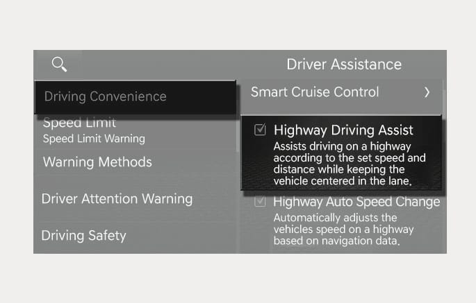 Highway Driving Assist: Select Setup > Vehicle > Driver Assistance > Driving Convenience > Highway Driving Assist from the Settings menu in the infotainment system to set whether to use each function.