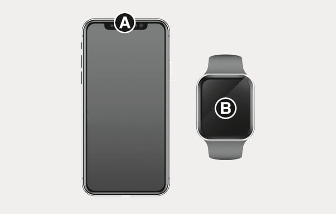 The NFC Antenna position on Apple iPhone is located at the top of the rear [A] and Apple WATCH is located at the center of the screen [B].