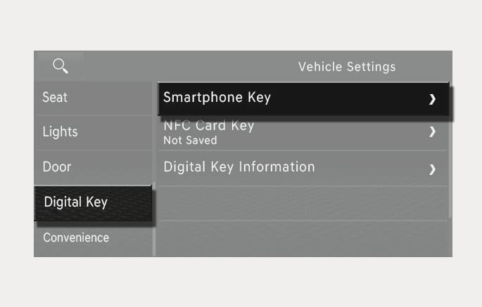 Put the gear in P (Park), and then select Setup > Vehicle > Digital Key > Smartphone Key > My Smartphone Key and press the Save button from the Settings menu in the infotainment system.
