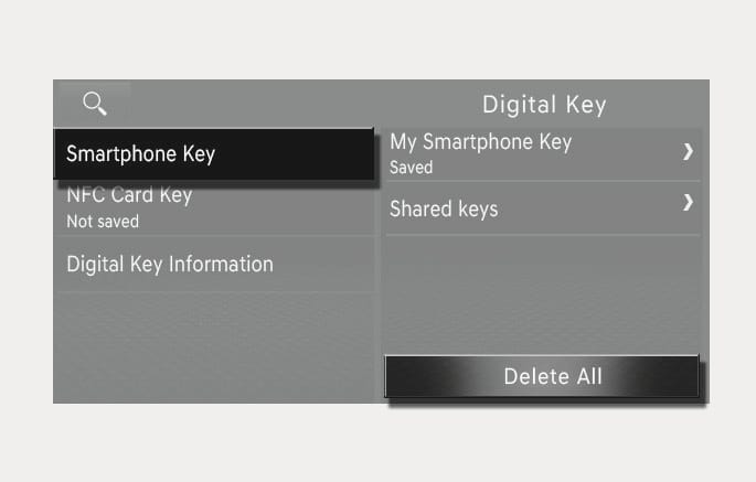 To delete all the registered digital key (smartphone), select Setup > Vehicle > Digital Key > Smartphone key > Delete All from the Settings menu in the infotainment system.