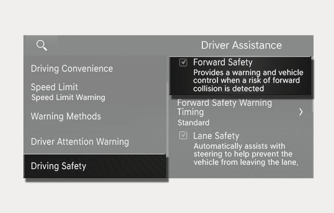 If Forward Safety is selected, Forward Collision-Avoidance Assist will warn the driver with a warning message, an audible warning depending on the collision risk levels. Braking assist will be applied depending on the collision risk levels. If Forward Safety is deselected, Forward Safety will turn off. The