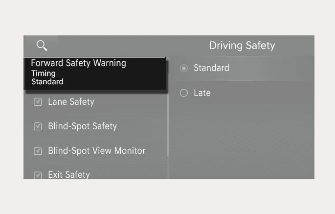 With the engine on, select Setup > Vehicle > Driver Assistance > Driving Safety > Forward Safety Warning Timing from the Settings menu in the infotainment system to change the initial warning activation time for Forward Collision-Avoidance Assist. The warning time can be set to either Standard or Late.