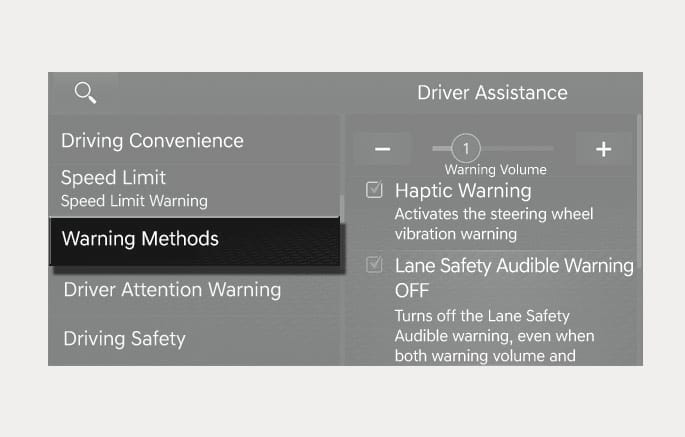 Haptic Warning: Select Setup > Vehicle > Driver Assistance > Warning Methods > Haptic Warning from the Settings menu in the infotainment system to set haptic warning.