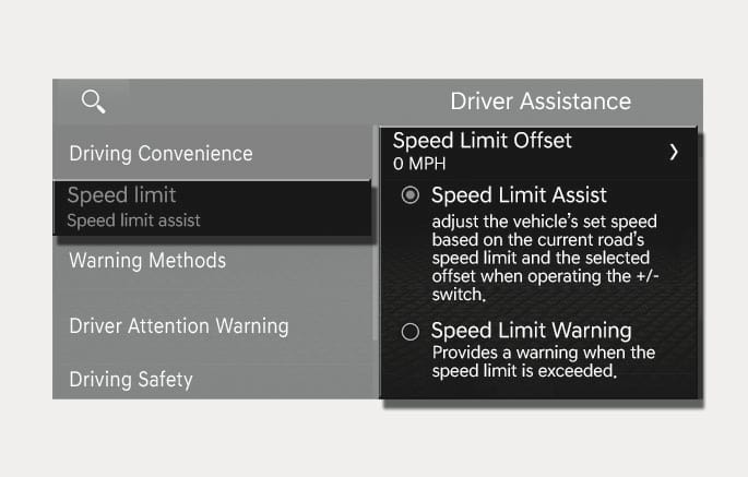 With the engine on, select or deselect Setup > Vehicle > Driver Assistance > Speed Limit Assist from the Settings menu in the infotainment system to set whether to use each function.