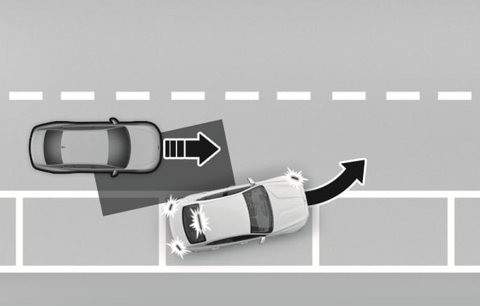 When you are driving forward out of a parking space, if Blind-Spot Collision-Avoidance Assist judges that there is a collision risk with an approaching vehicle in the blind spot, it can help avoid collision by applying the brake.