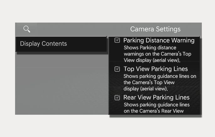 In the Display Contents, you can change settings for Parking Distance Warning, Top View Parking Lines and Rear View Parking Lines.