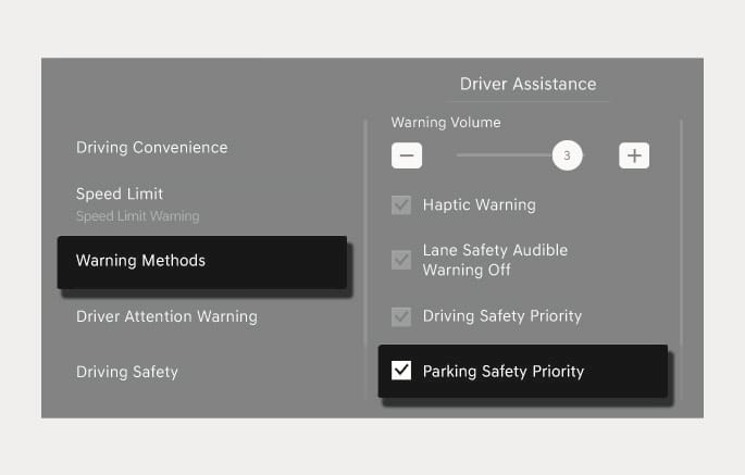 Parking Safety Priority: Select Setup > Vehicle > Driver Assistance > Warning Methods > Parking Safety Priority from the Settings menu in the infotainment system.
