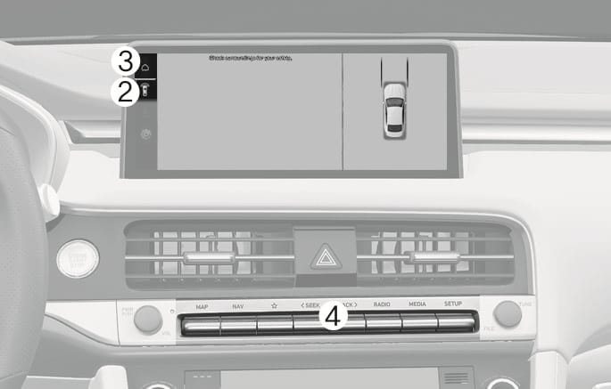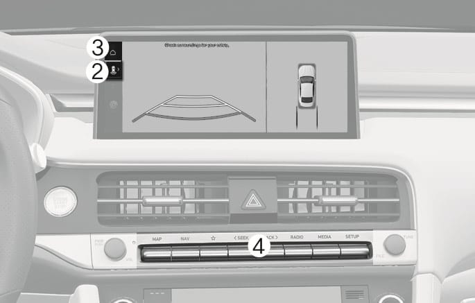 The Parking/View button (1), the home button (3), or the infotainment system button (4) is pressed.