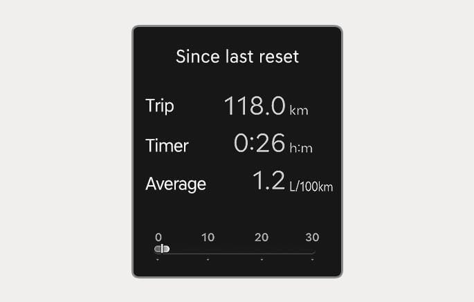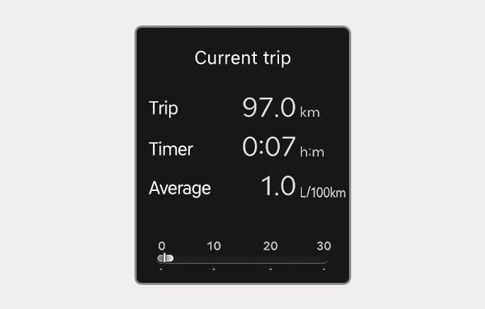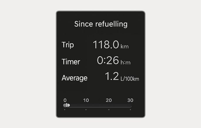 After the vehicle has been refueled, the trip distance, total driving time, average fuel economy, and instant fuel economy are displayed.