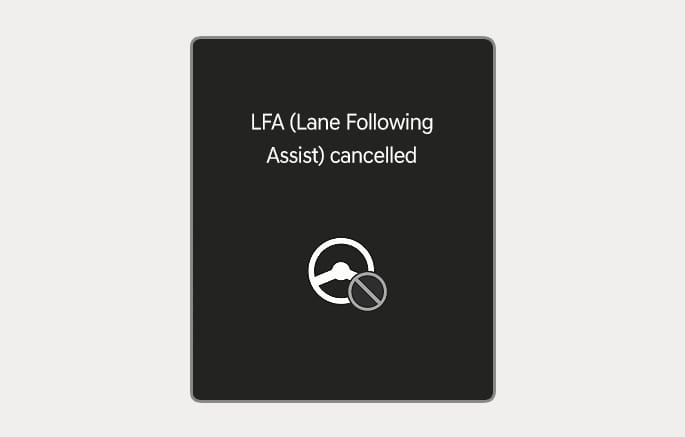 If you do not have your hands on the steering wheel after the hands-off warning, the "LFA (Lane Following Assist) cancelled" warning message may appear and Lane Following Assist is automatically cancelled.