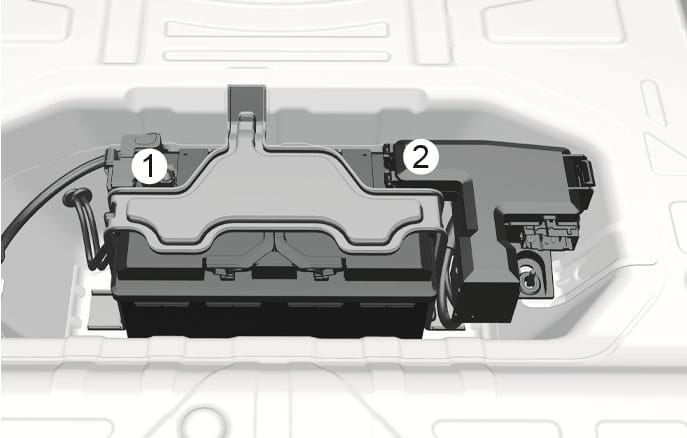 When replacing the battery, disconnect the negative (-) cable (1) and remove the positive (+) battery fuse box (2).
