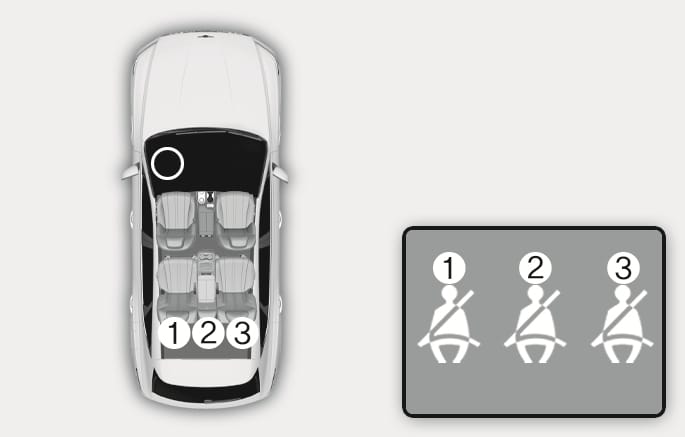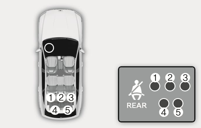 With the Engine Start/Stop button in the ON position, if the second row center seat passenger’s seat belt is not fastened, the corresponding seat belt warning light will illuminate for 70 seconds. But, if the seatbelt is fastened after 6 seconds, the corresponding seat belt warning light will immediately turn off.