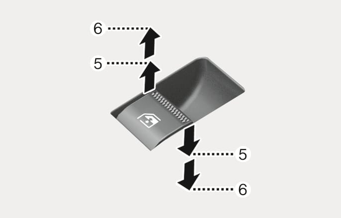 Pressing or pulling up the power window switch momentarily to the second detent position (6) completely lowers or lifts the window even when the switch is released. To stop the window at the desired position while the window is operating, pull up or press down and release the switch.