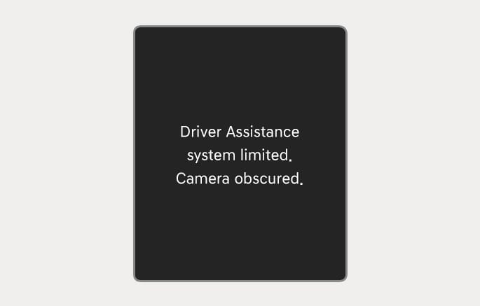 The "Driver Assistance system limited. Camera obscured." warning message may appear, and the